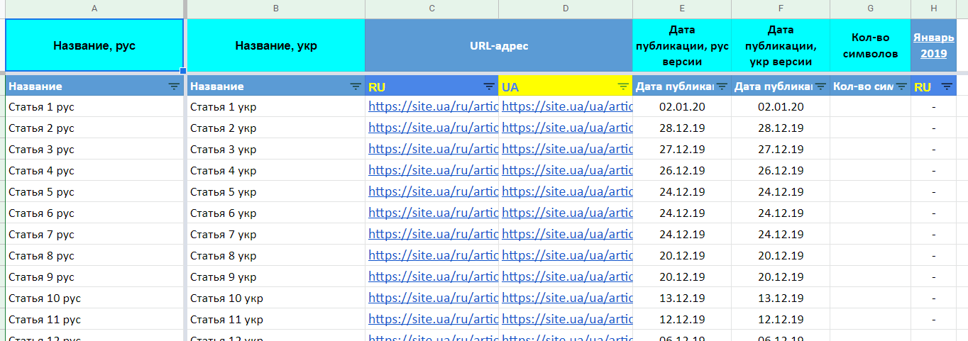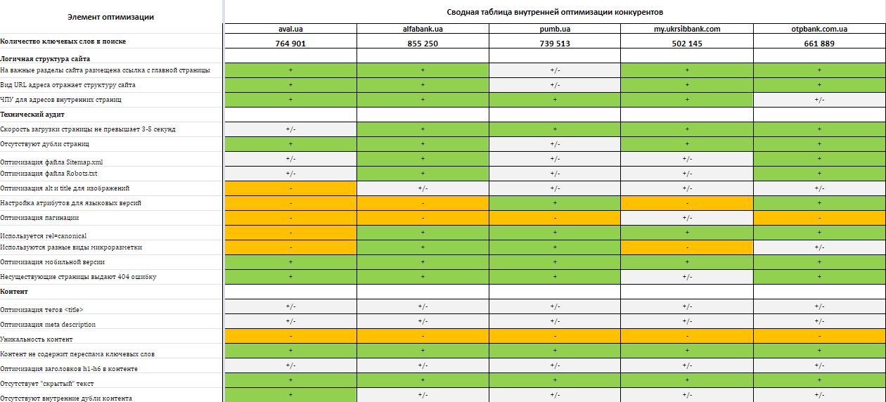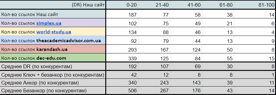 - ручний аудит. Наприклад, аналіз конкурентів у гугл-таблицях за різними показниками: