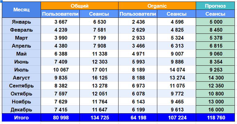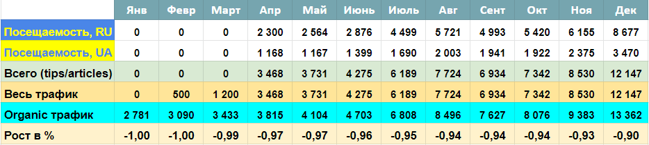 У подібних таблицях видно сезонність, апдейти Google, якщо вони були, ріст та падіння трафіку, чи виконуються ваші прогнози тощо.