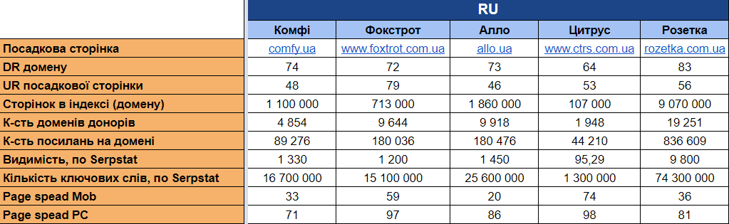 - яке місце ваш сайт займає в порівнянні з конкурентами: за трафіком, за об’ємом ключів, за швидкістю, за DA?