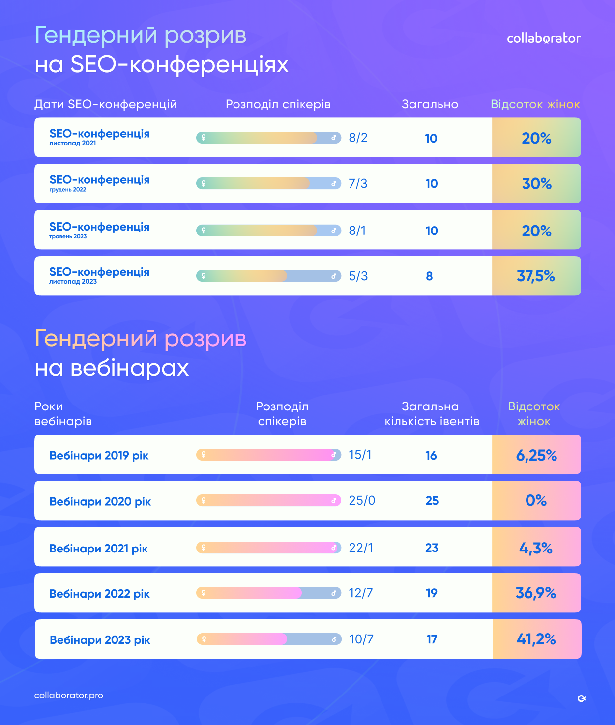 Ми у Collaborator раді співпраці з SEO-фахівчинями та експертками у різних галузях, регулярно запрошуємо їх ділитись своїм досвідом й експертизою на наших освітніх івентах: безкоштовних вебінарах, QA-сесіях, масштабних SEO-конференціях.