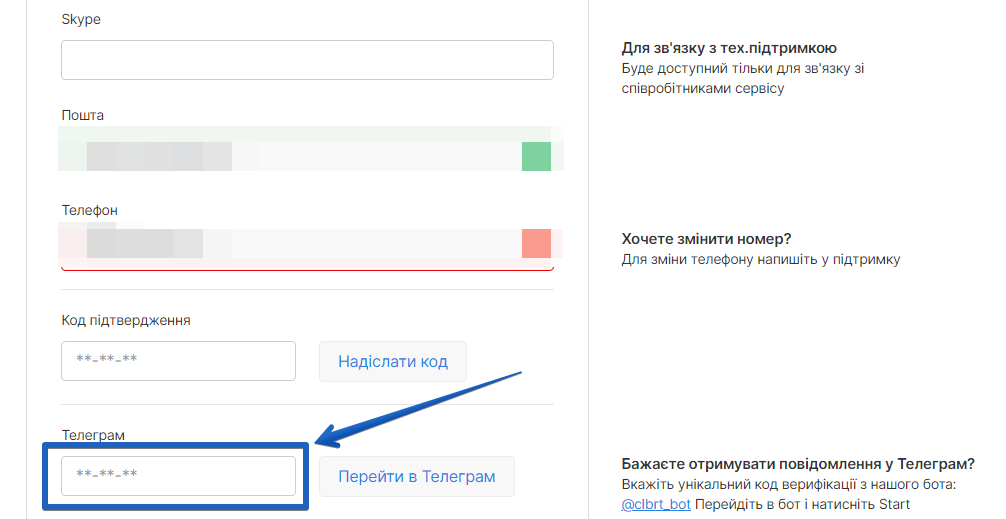 3. Бот вам надішле 6-значний код, його потрібно ввести в поле «Телеграм». Зверніть увагу, що код дійсний протягом 5 хвилин.