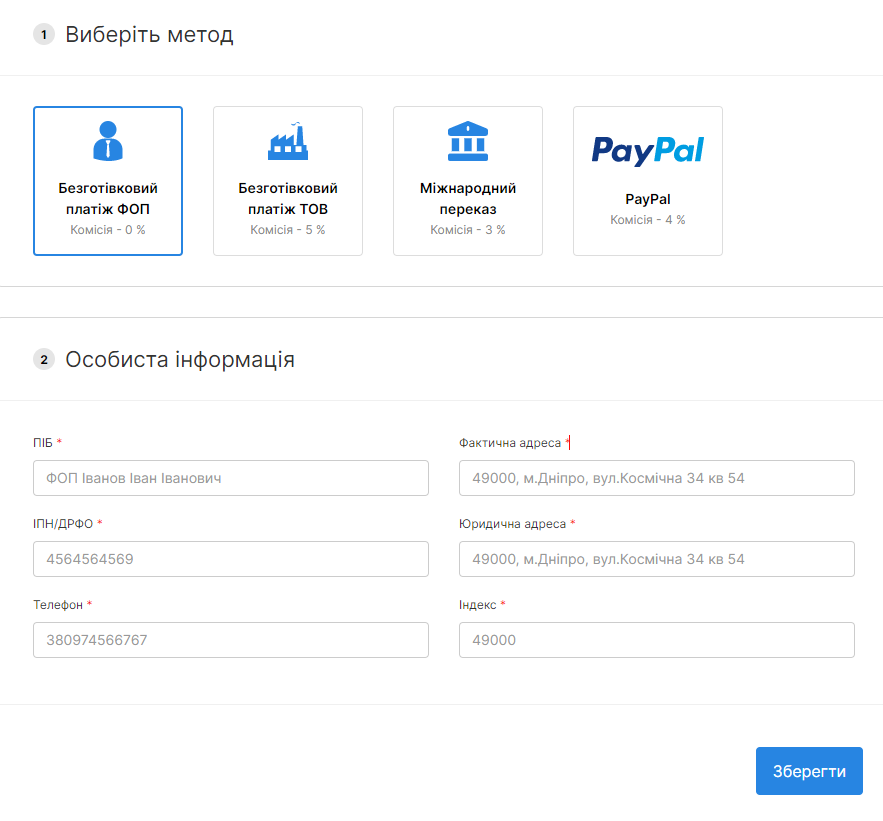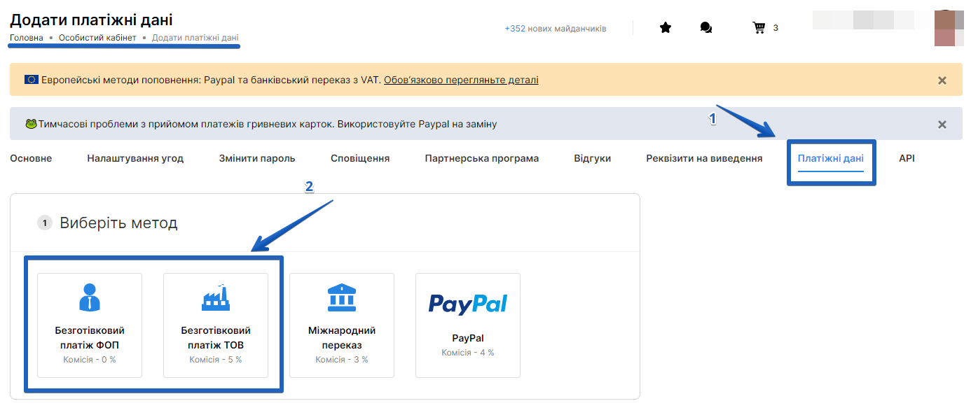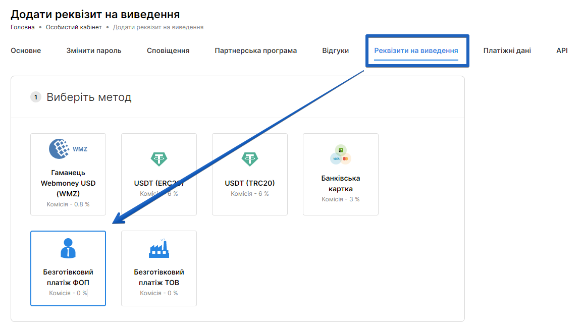- перейдіть в Особистий кабінет в розділ Платіжні дані та оберіть метод — ФОП або ТОВ