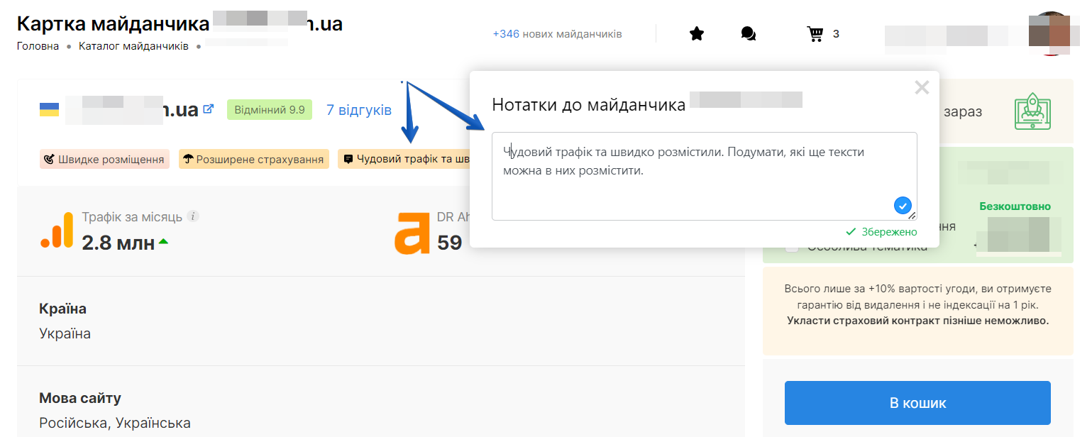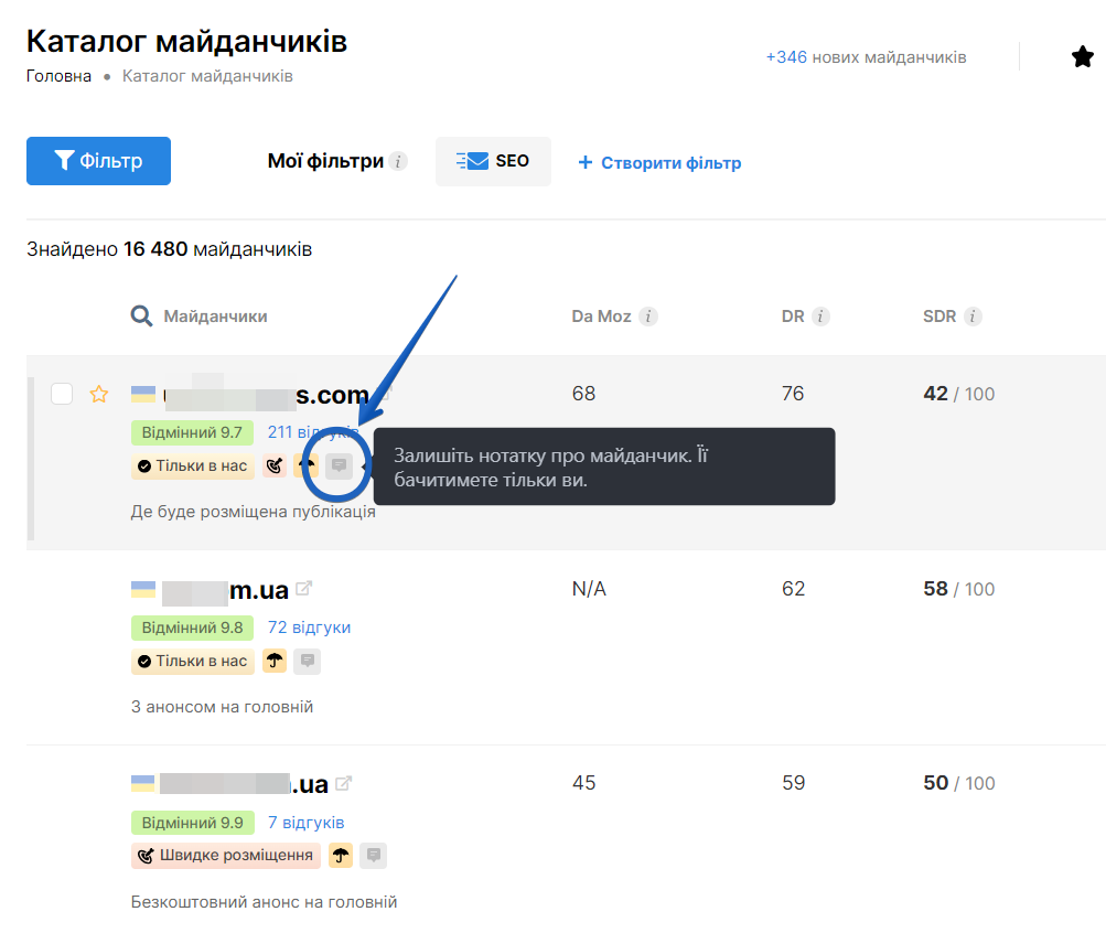 Тепер у користувачів є можливість залишати свої нотатки по кожному майданчику. Це дозволить швидко пригадати інформацію про сайт без потреби повторно його аналізувати. А ще — спростить комунікацію в командах, якщо ви делегуєте замовлення гостьових постів колегам.