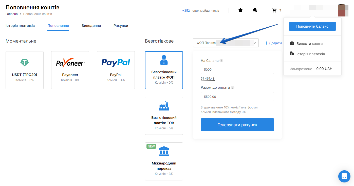 - тепер при Поповненні балансу та виборі ФОП як платіжного методу відобразиться потрібна інформація