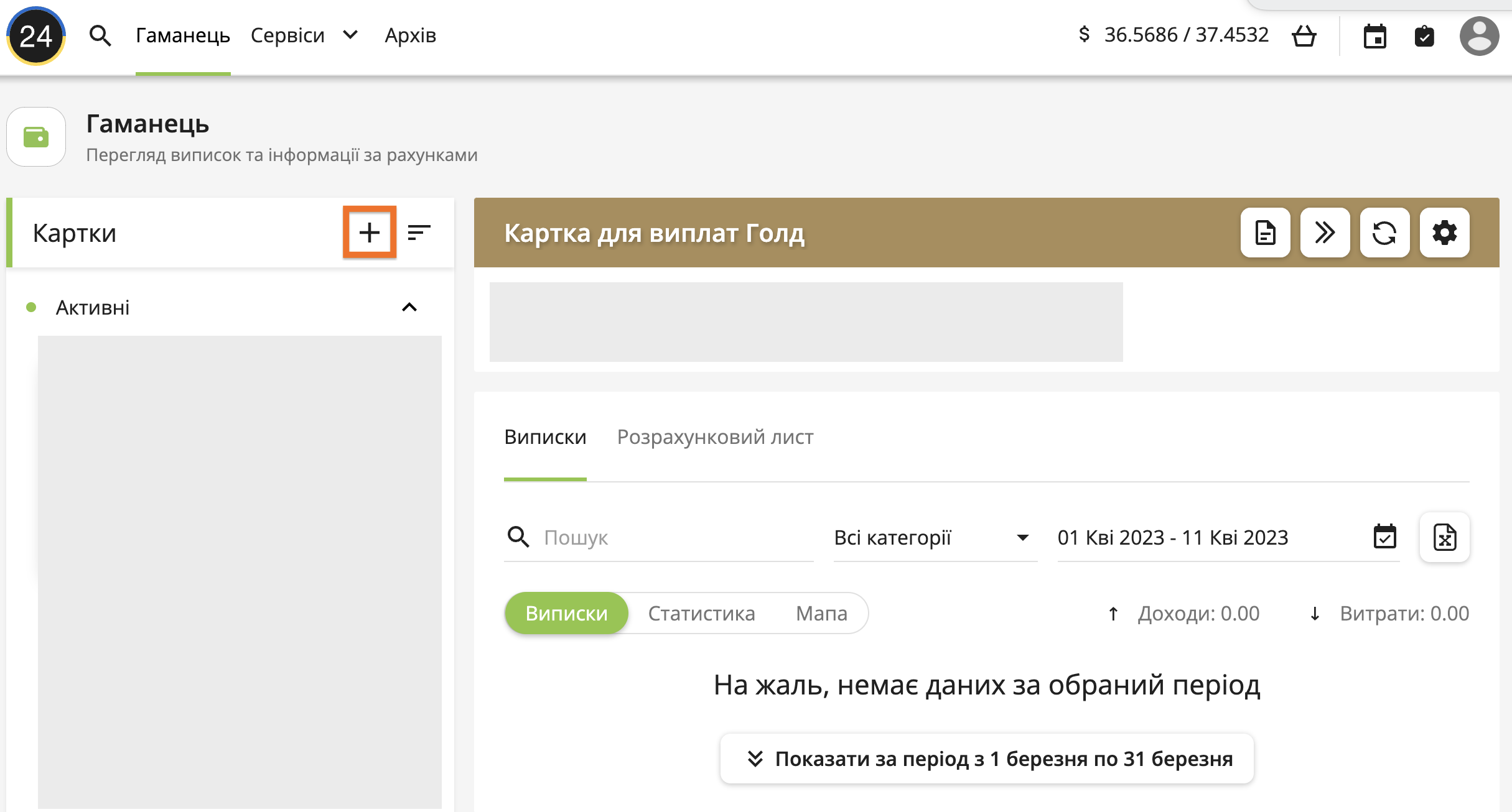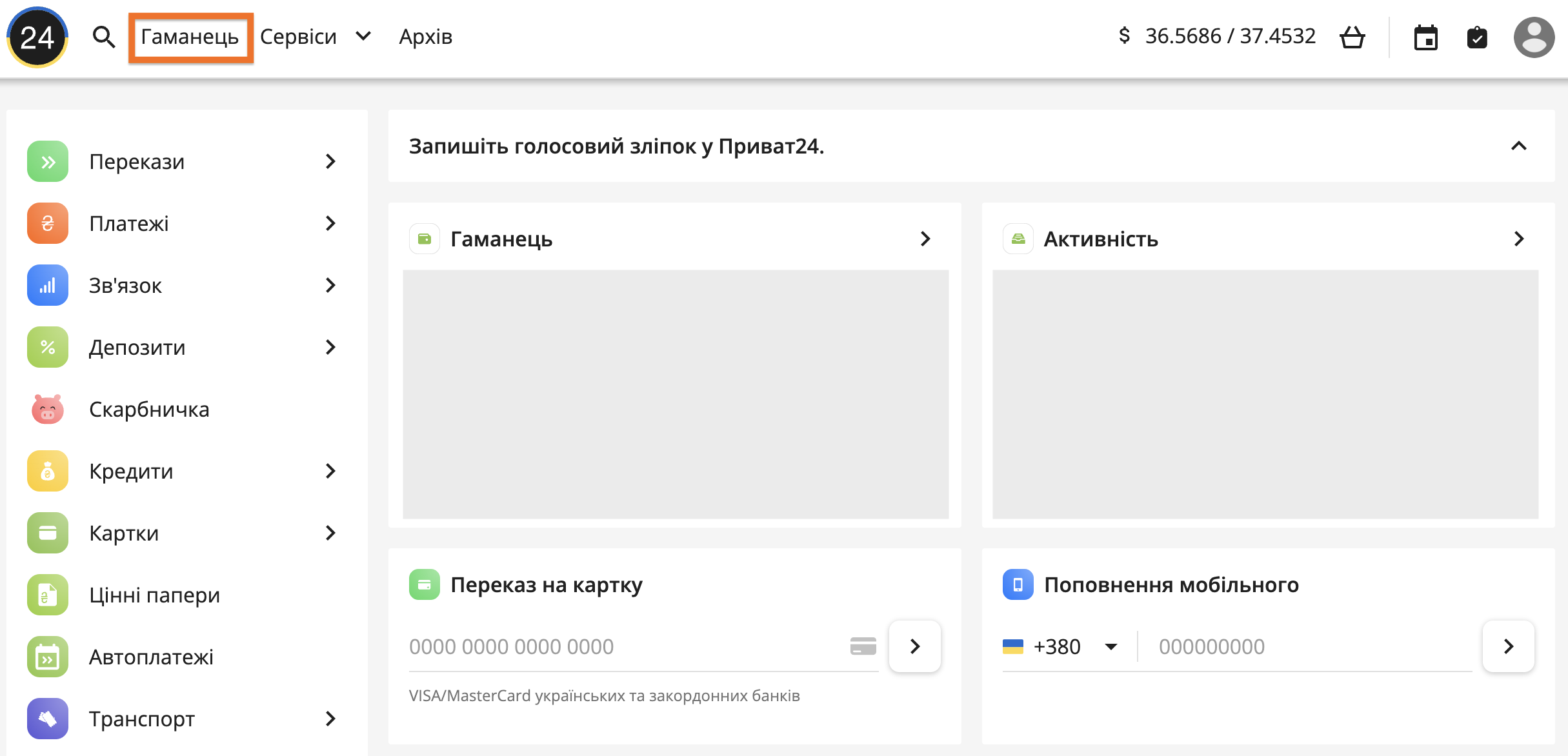 1. Войдите в аккаунт Приват24 и перейдите в раздел Кошелек