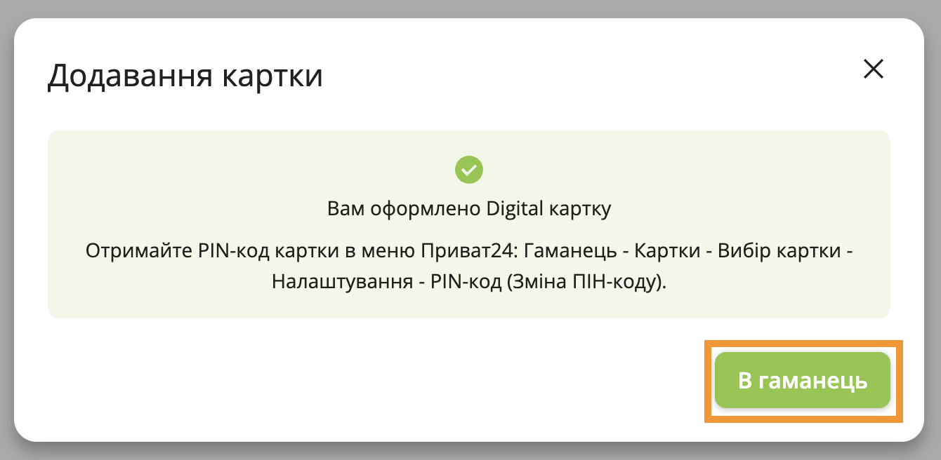 7. Получите сообщение об успешном создании карты и перейдите в Кошелек