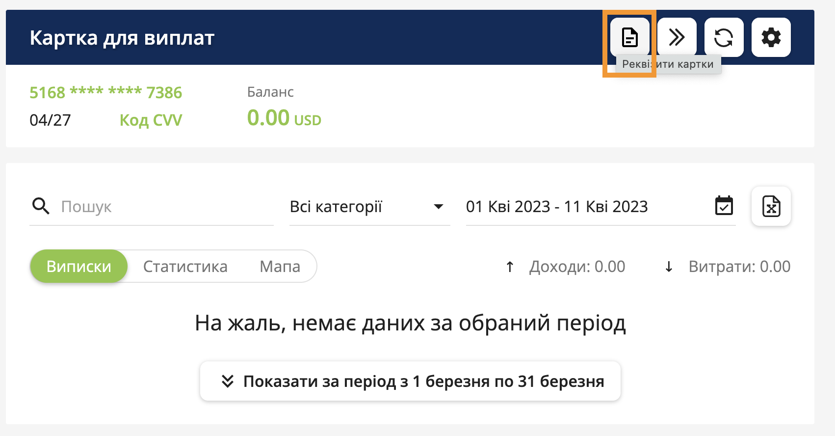 1. Перейдите в Кошелек и выберите карту в долларах, а не гривне или другой валюте. Нажмите “Реквизиты карты”