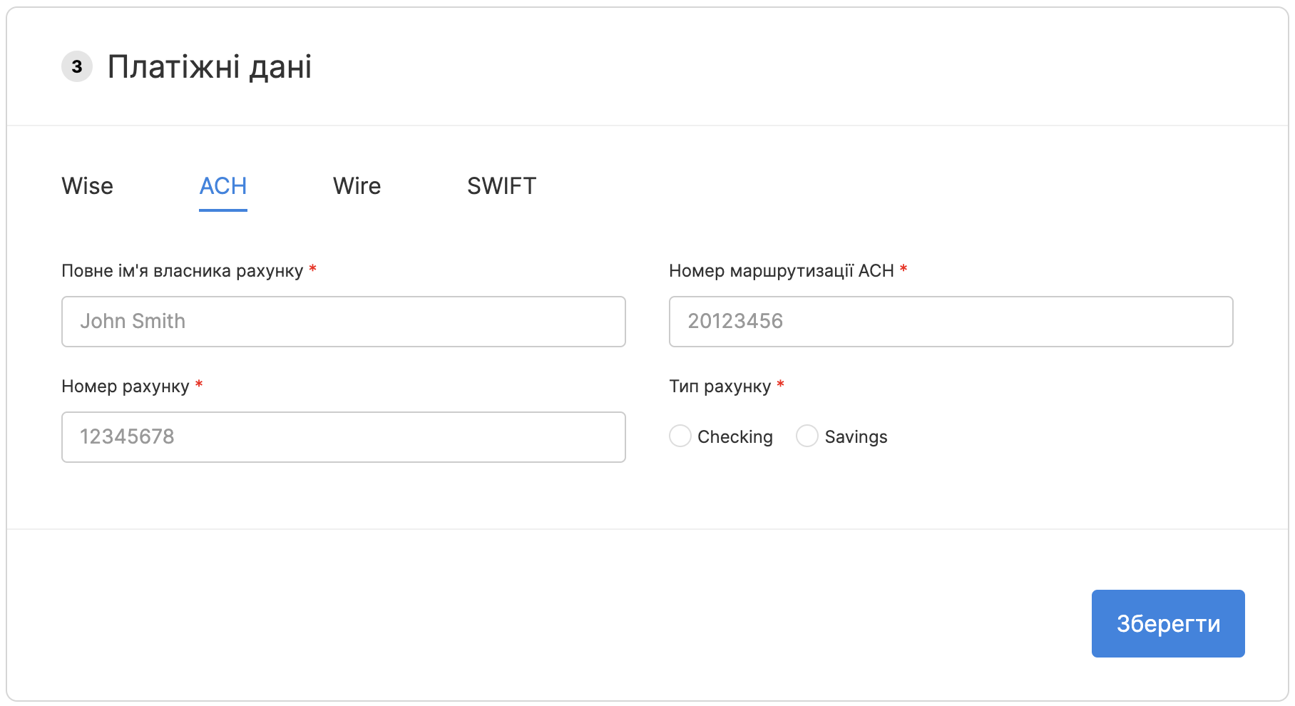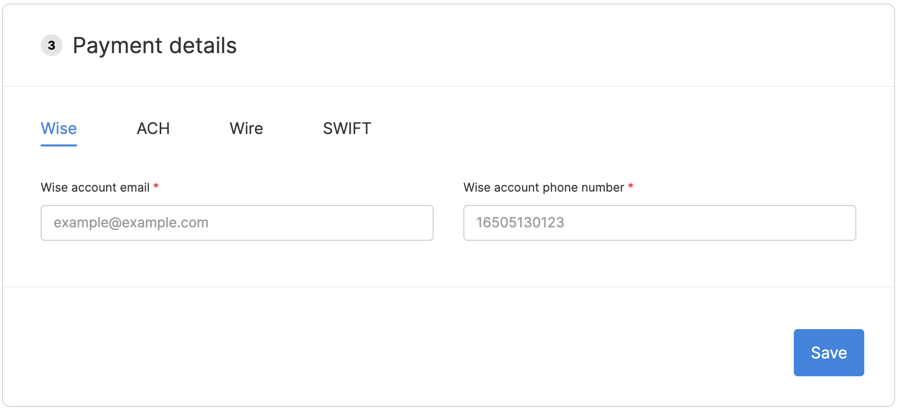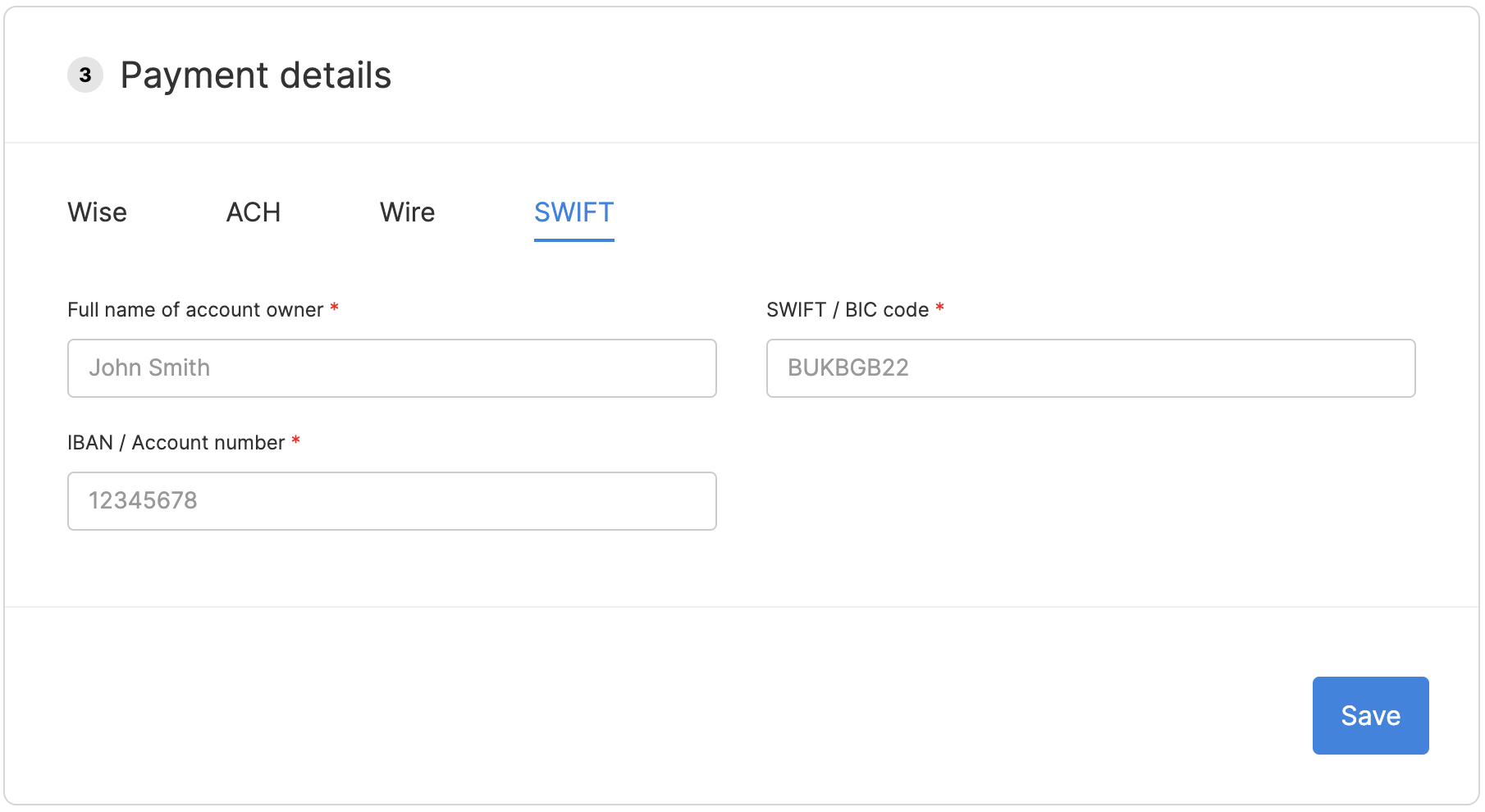 Если вы используете платежную систему wise.com, вы можете получать выплаты, указав данные аккаунта:
