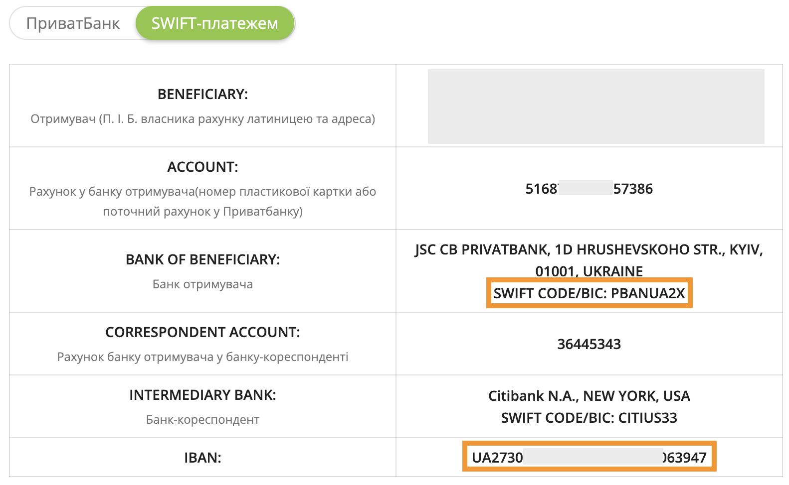 3. Выберите метод SWIFT и укажите данные счета в долларах, а не в гривне или другой валюте (если не знаете, где их взять, смотрите инструкции ниже)